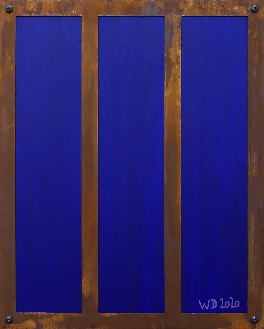 Als ich begann, „Just Blue“ zu malen, wollte ich zunächst eine vollkommen ruhige, homogene Farbfläche schaffen. Nach dem Trocknen behielt die Acrylfarbe ihre Leuchtkraft – und genau in diesem Moment entstand die Idee, das Bild mit einem zurückhaltenden Rahmen aus Cortenstahl zu kombinieren.